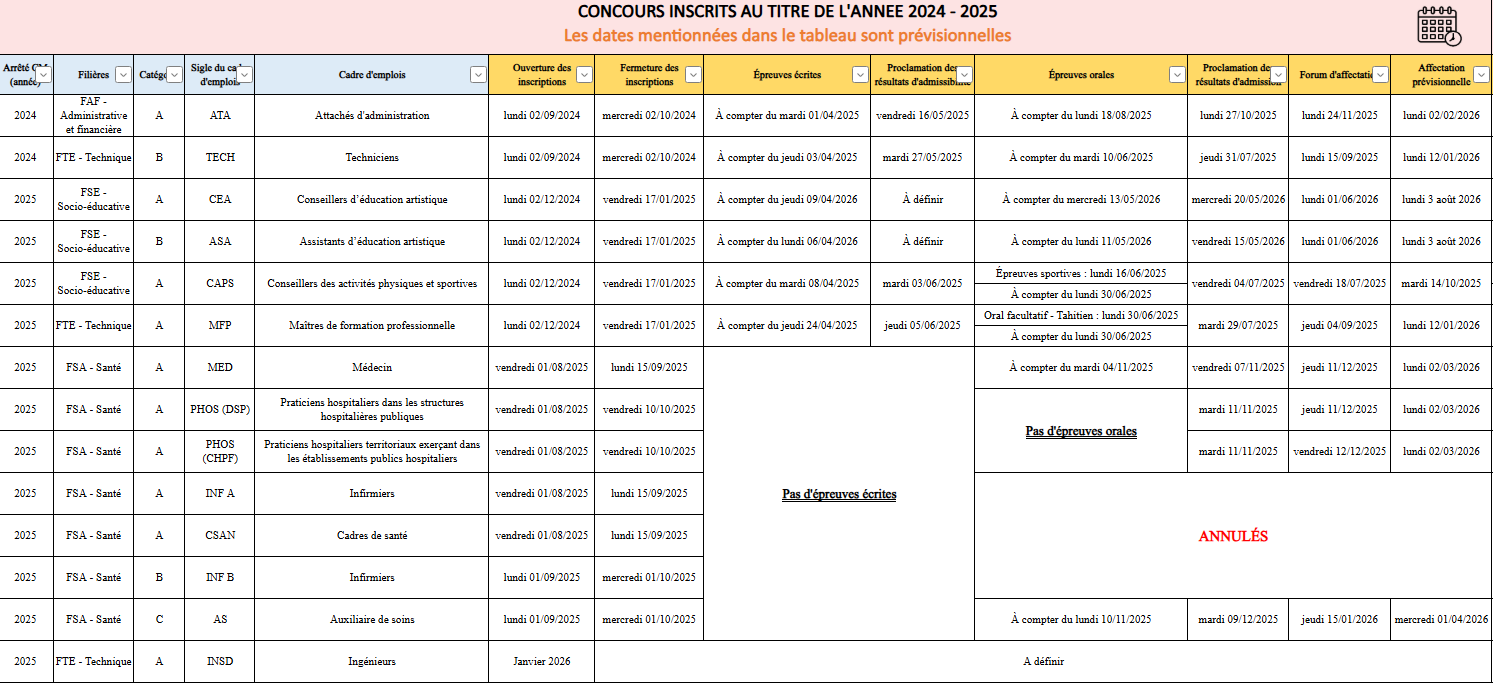 Le calendrier des concours inscrits au titre de l’année 2024 et 2025 est disponible en cliquant sur l’image ci-dessous